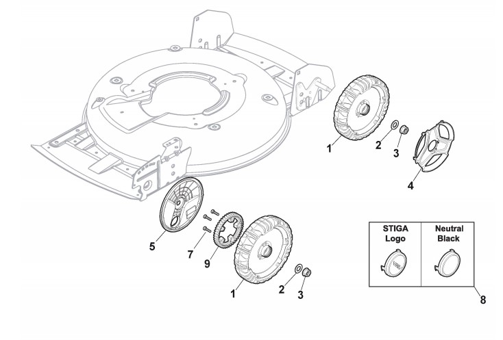 Hier finden Sie alle Ersatzteile von Stiga Benzin-Rasenmäher ab 2020 Multiclip Pro 50 SX H (Geräte Nr 291502138/ST1) aus dem Zeichnungsblatt Rad und Radkappe: