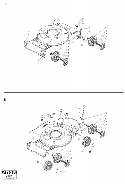 Hier finden Sie alle Ersatzteile von Stiga Benzin-Rasenmäher ab 2009 Multiclip 50 S (Geräte Nr 291502044/ST9) aus dem Zeichnungsblatt Radaufhängung (1):