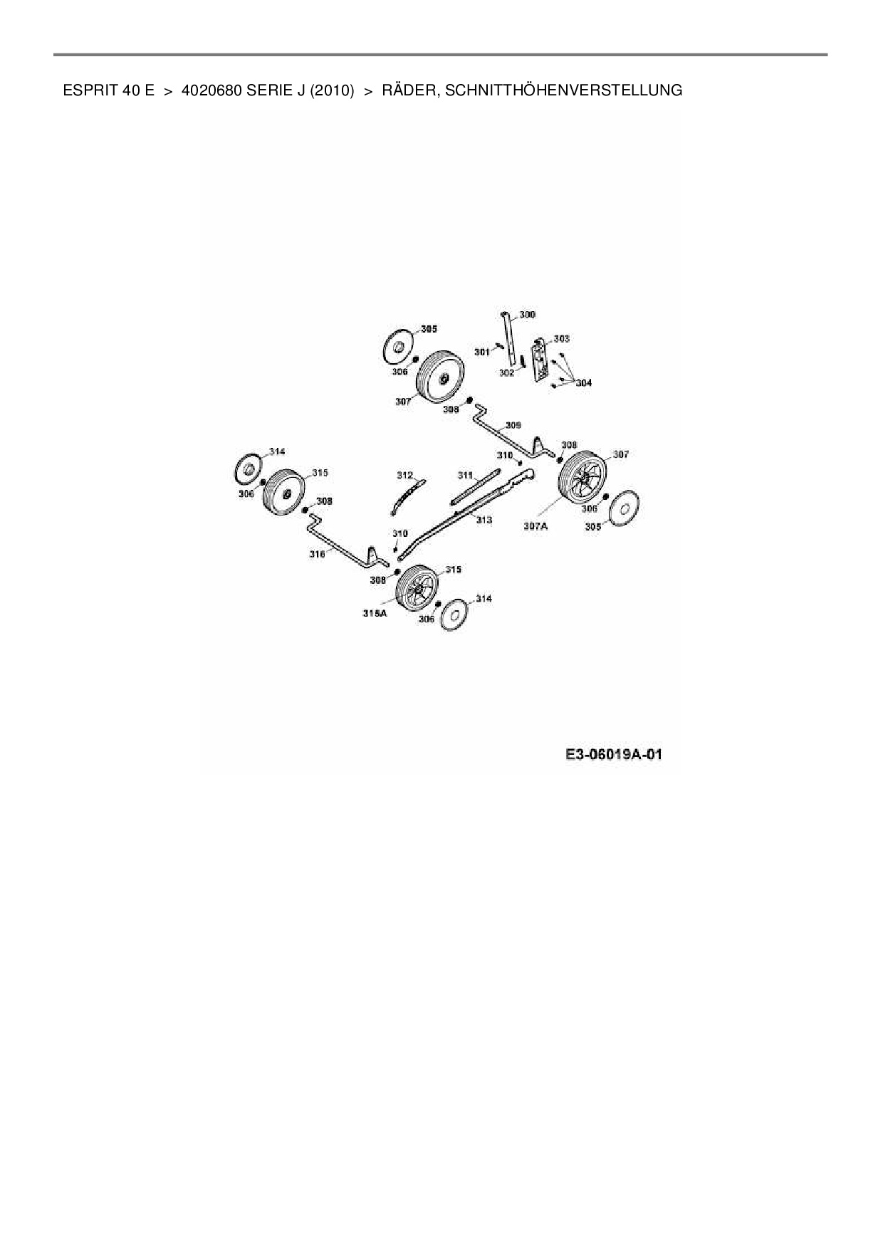 Download Ersatzteil-Zeichnung Wolf-Garten Esprit 40 E Zeichnung Räder, Schnitthöhenverstellung (PDF-Format)