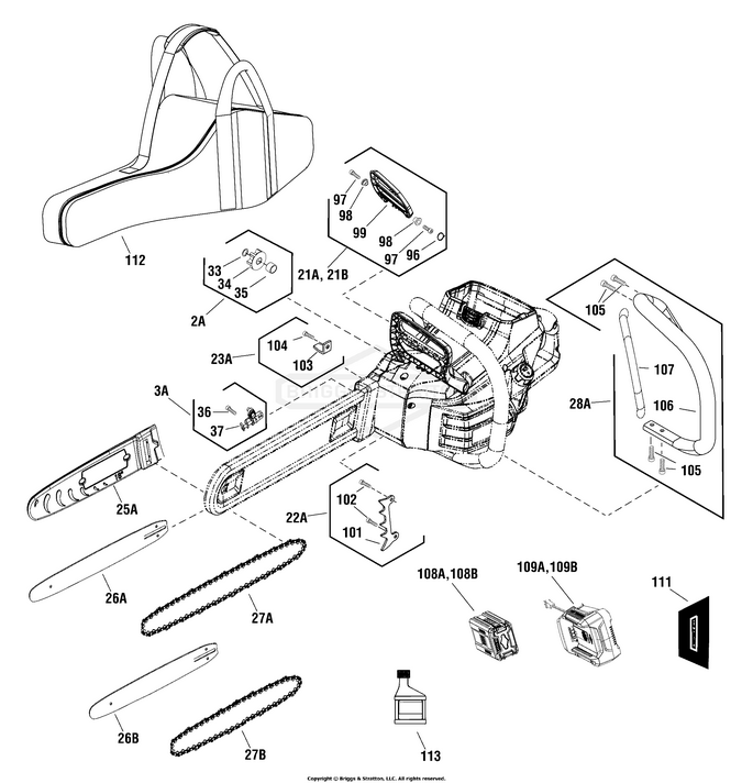 Zeichnung Snapper 1687878-00 - ESXDCS82, 82V Battery Electric 18" Chain Saw Kit - Zeichnungsgruppe Säge: