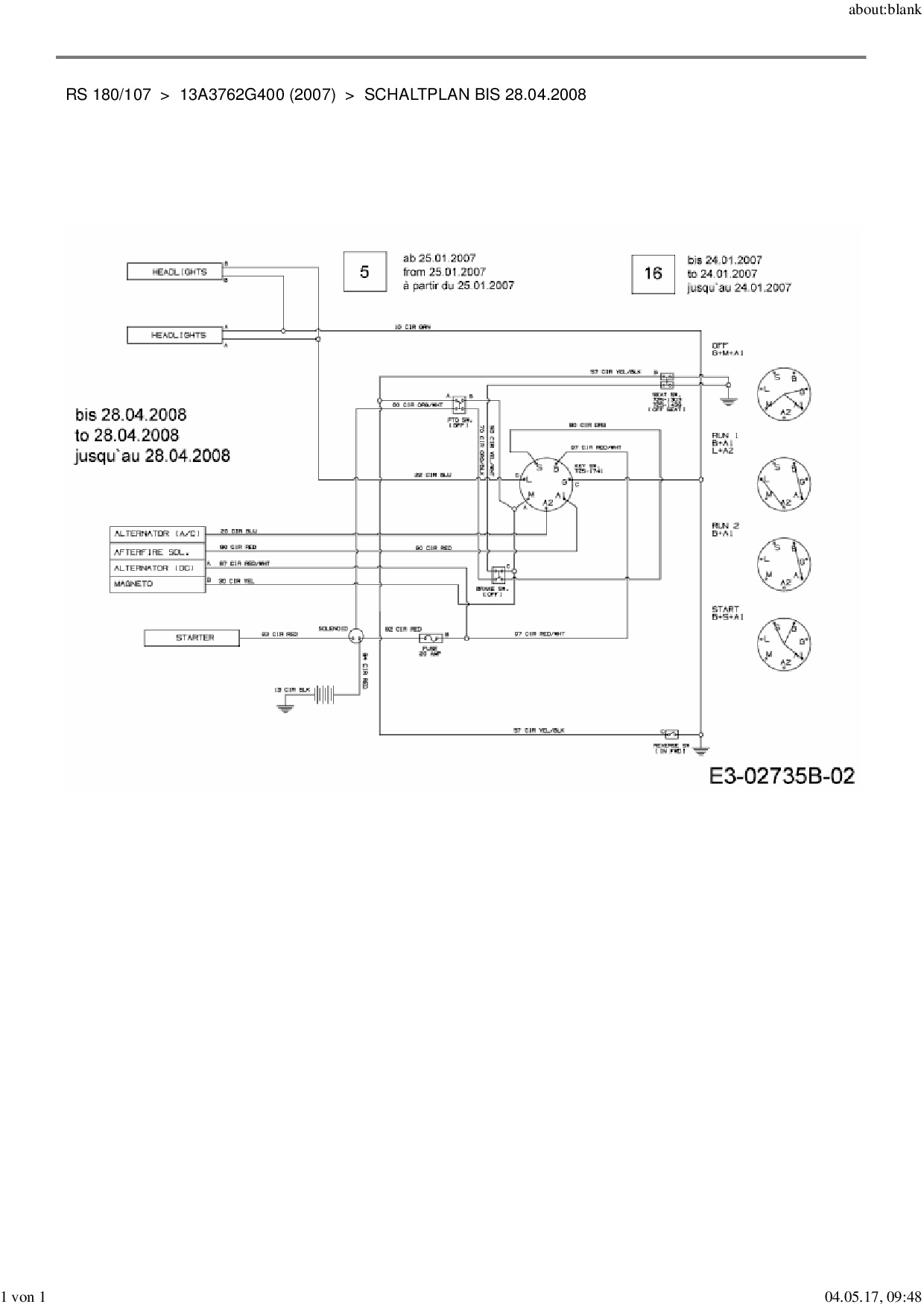 Ersatzteile für Rasentraktor MTD RS 180/107 aus der Zeichnung Schaltplan bis 28.04.2008: