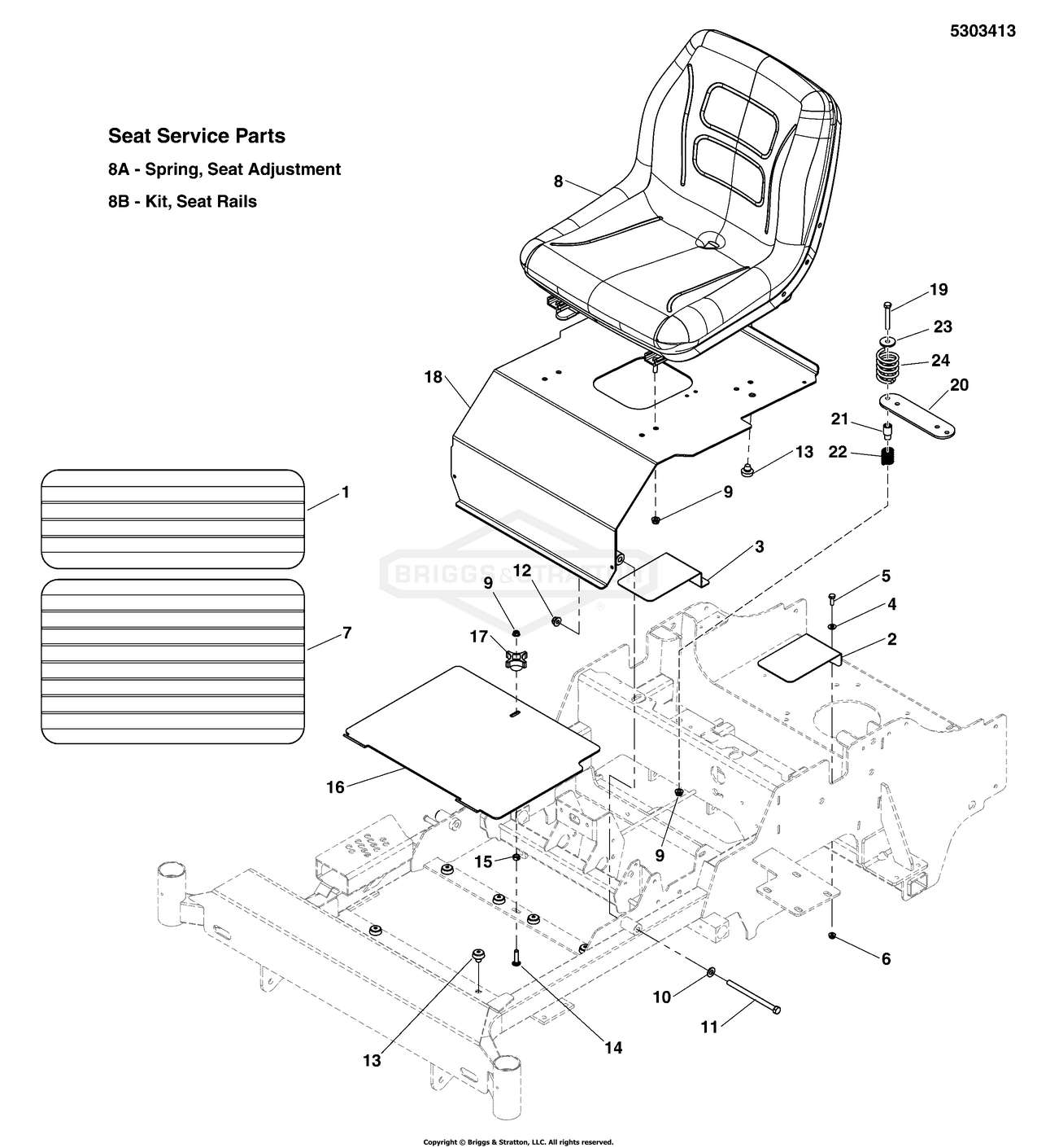 Zeichnung Snapper 5901402 - 550ZB2561 ANSI-EXP, 61" 25HP ZTR 550Z Ansi-Exp Series - Zeichnungsgruppe Seat Mount & Floor Group: