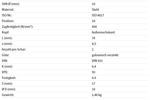 Sechskantschrauben für Agria 3400 Fingerbalken Freischnitt (mit Verstärkungsleiste) # Pos. 16