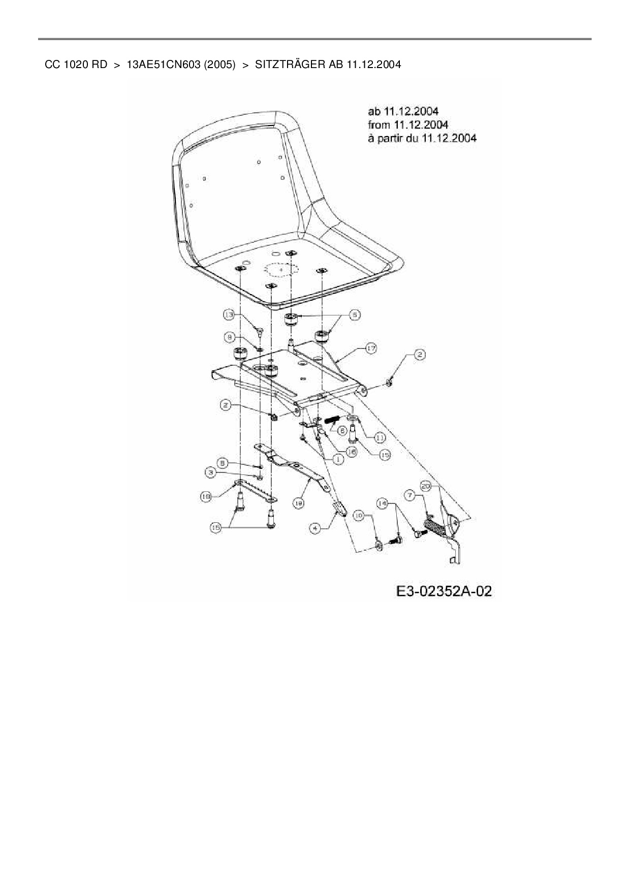 Ersatzteile für Rasentraktor Cub Cadet CC 1020 RD aus der Zeichnung Sitzträger ab 11.12.2004: