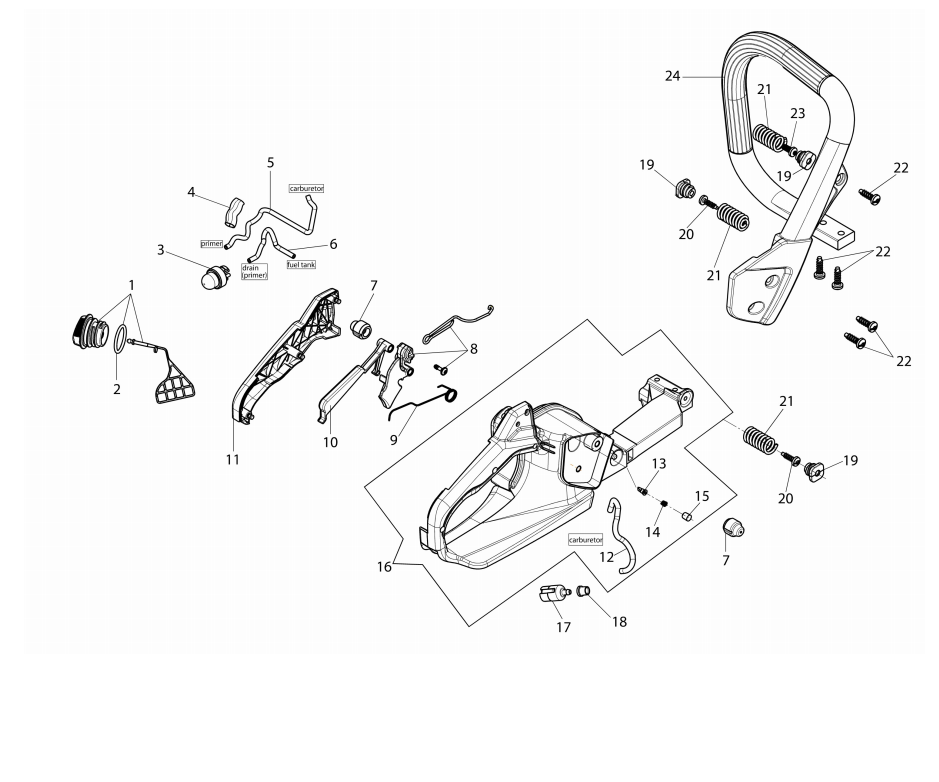 Hier finden Sie alle Ersatzteile für Oleo-Mac Motorsäge GS 37 (Euro 1) aus der Zeichnung für Tank und Handgriff:
