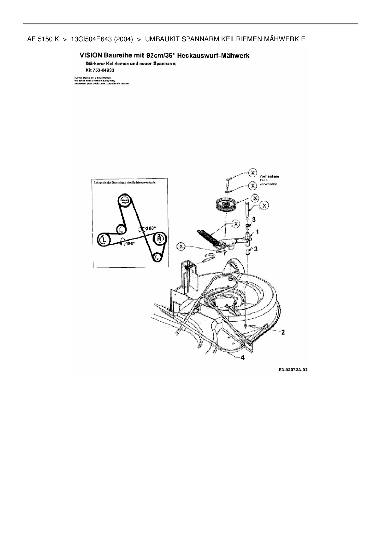 Ersatzteile für Rasentraktor Yard-Man AE 5150 K aus der Zeichnung Umbaukit Spannarm Keilriemen Mähwerk E: