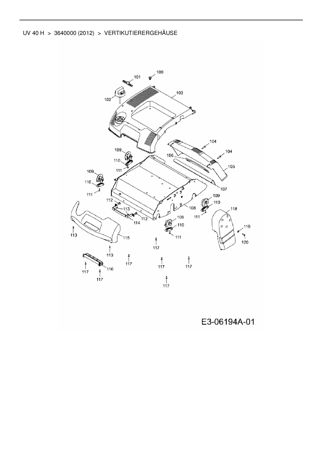 Zeichnung für Wolf-Garten Motorvertikutierer UV 40 H mit der Geräte-Artikelnr. 3640000 ab Baujahr 2012: