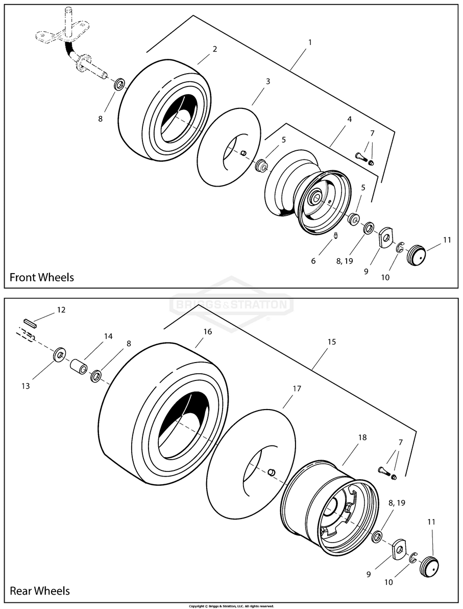 Hier finden Sie alle Ersatzteile von Snapper 2690865-01 - ELT22, 22HP Hydro Drive Euro Tractor RMO LT200 Series TRACTOR ONLY der Zeichnungsgruppe Wheels & Tires Group: