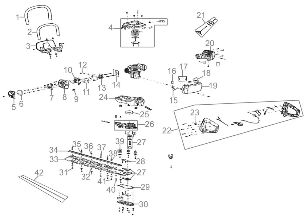 Zeichnung Sollten Sie Fragen zu einem Ersatzteil vom Mr. Gardener Benzin-Heckenschere BHS 615-2 (Art-Nr. 5128) haben, können Sie uns gerne eine E-Mail (mit einem Foto vom Typenschild Ihres Gerätes) schreiben oder eine Ersatzteilanfrage stellen.