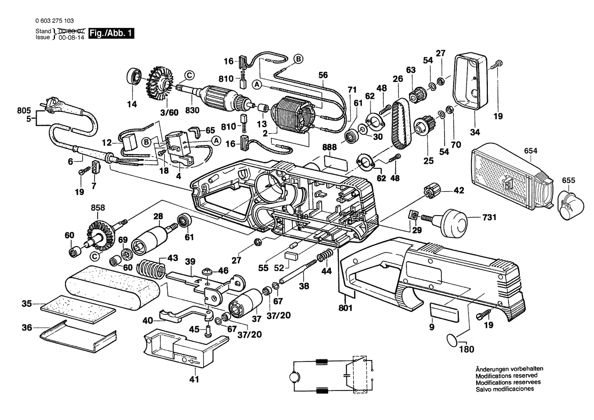 Zeichnung Sollten Sie Fragen zu einem Ersatzteil vom Bosch Bandschleifer PBS 60 | 230 V | 001 - EU (0 603 275 103) haben, können Sie uns gerne eine E-Mail (mit einem Foto vom Typenschild Ihres Gerätes) schreiben oder eine Ersatzteilanfrage stellen.