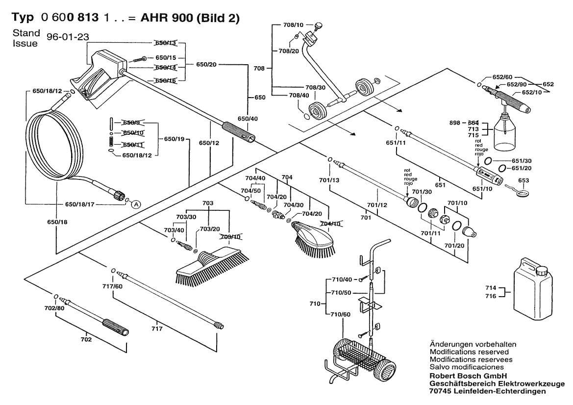 Zeichnung Sollten Sie Fragen zu einem Ersatzteil vom Bosch Hochdruckreiniger AHR 900 | 230 V | 001 - EU (0 600 813 164) haben, können Sie uns gerne eine E-Mail (mit einem Foto vom Typenschild Ihres Gerätes) schreiben oder eine Ersatzteilanfrage stellen.