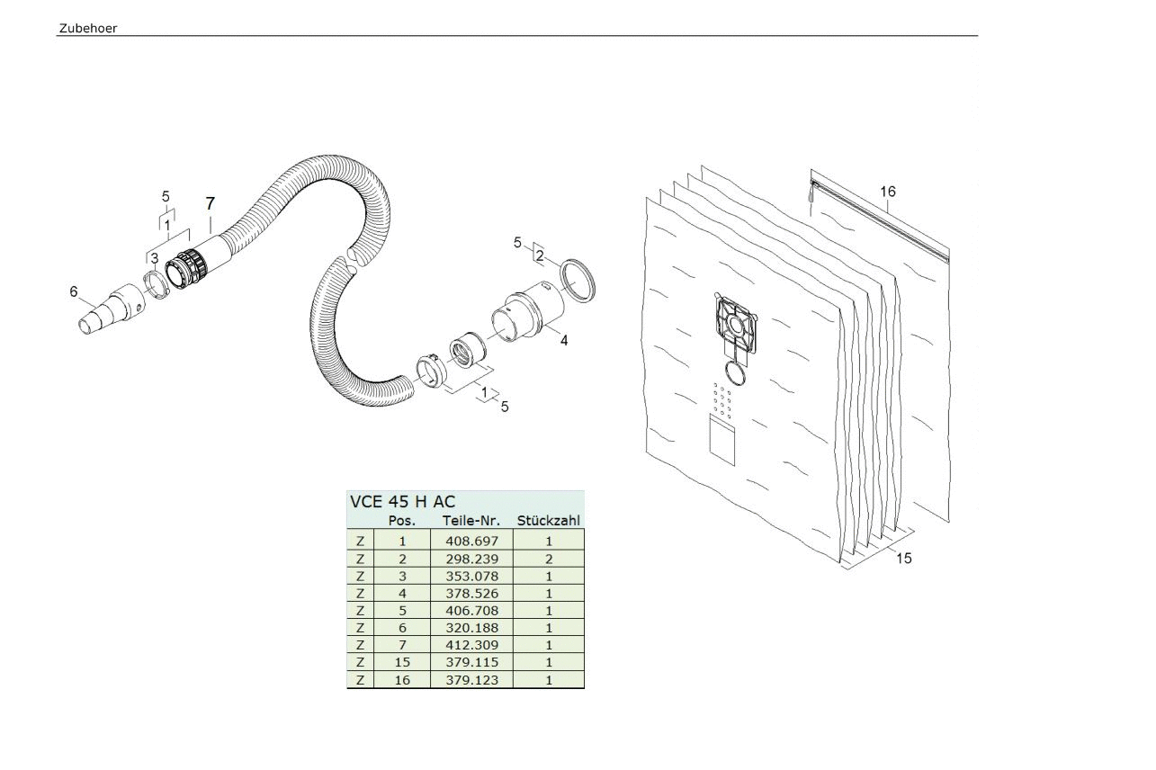 Zeichnung Sollten Sie Fragen zu einem Ersatzteil vom Flex VCE 45 H AC 230CEE haben, können Sie uns gerne eine E-Mail (mit einem Foto vom Typenschild Ihres Gerätes) schreiben oder eine Ersatzteilanfrage stellen.