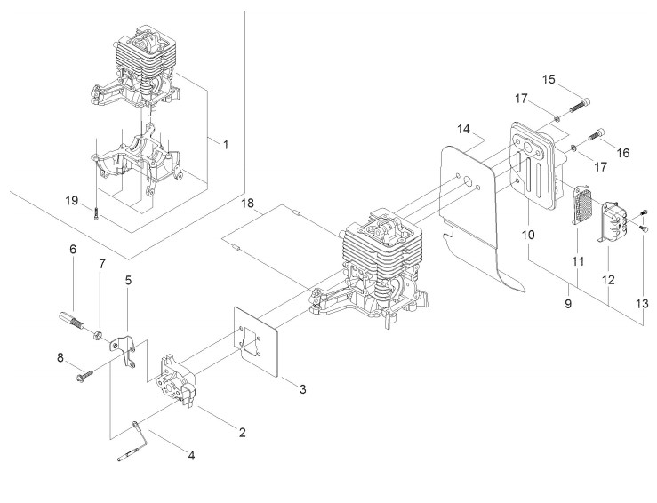 Zeichnung von shindaiwa Motorsensen Kreiselscheren T3410PRS-230 Zylinder, Auspuff, Ansaugkanal: