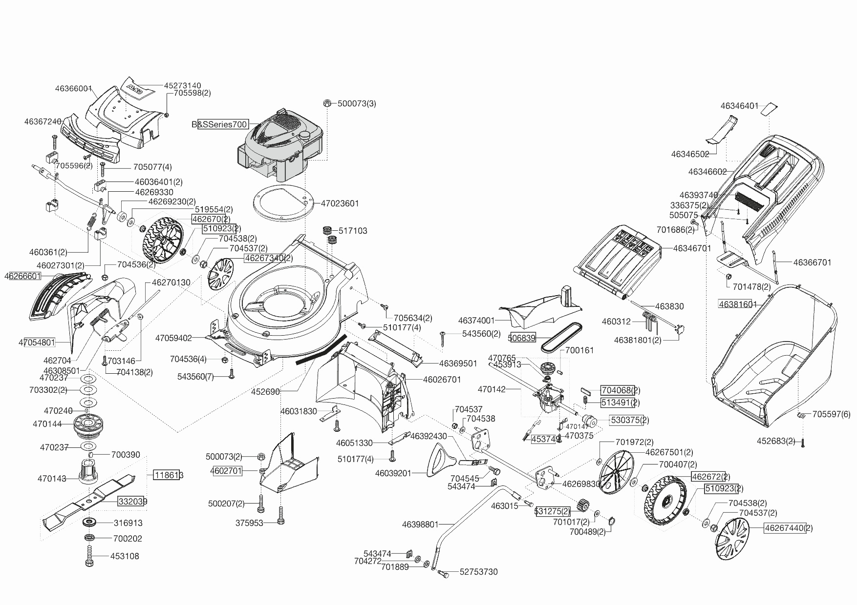 Zeichnungen von Powerline Benzinrasenmäher 4700 BRV ab 02/2011 mit der Geräte-Artikelnr. 119299:
