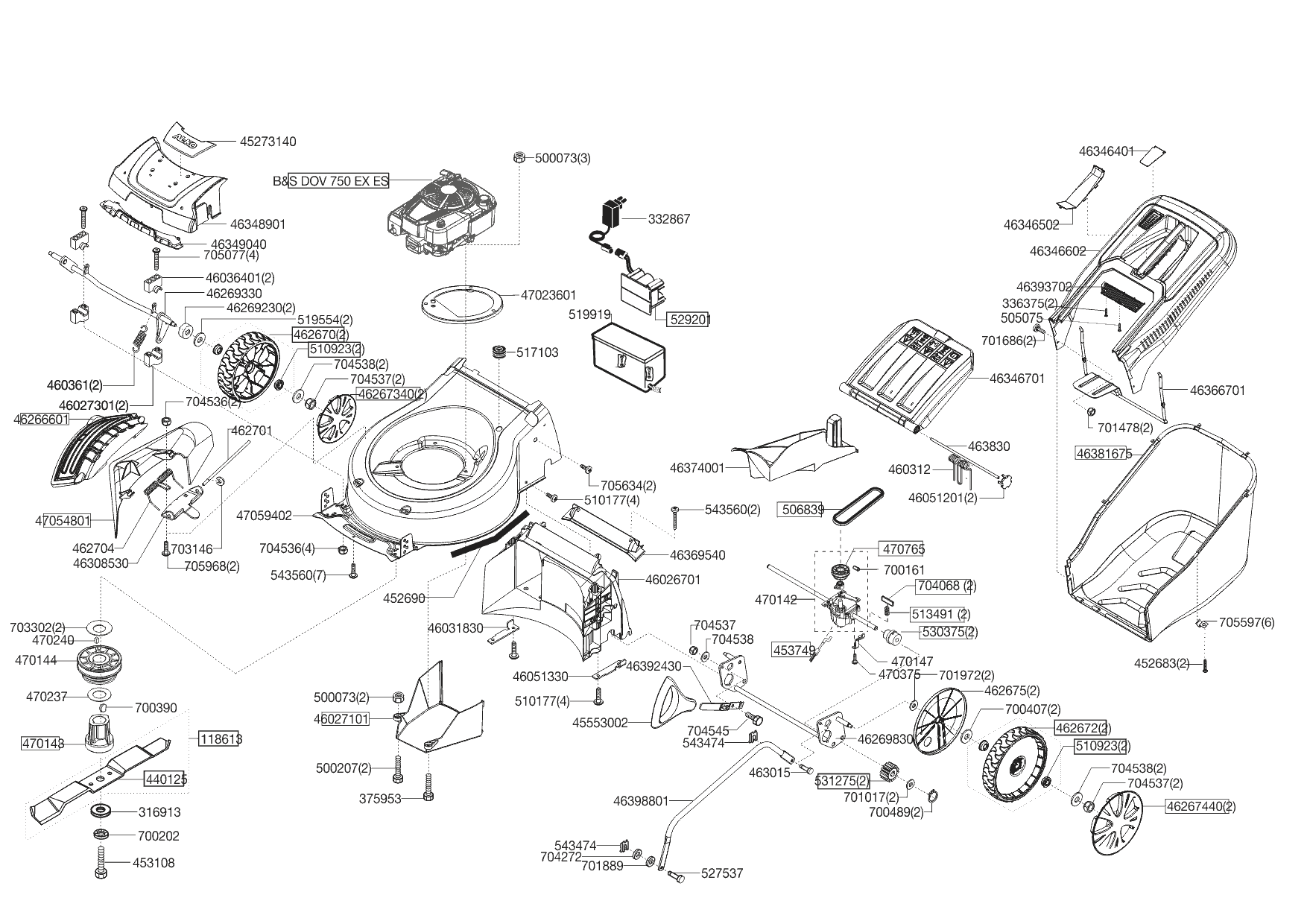 Zeichnungen von Powerline Benzinrasenmäher 4704 VSE Selection ab 03/2015 mit der Geräte-Artikelnr. 119531: